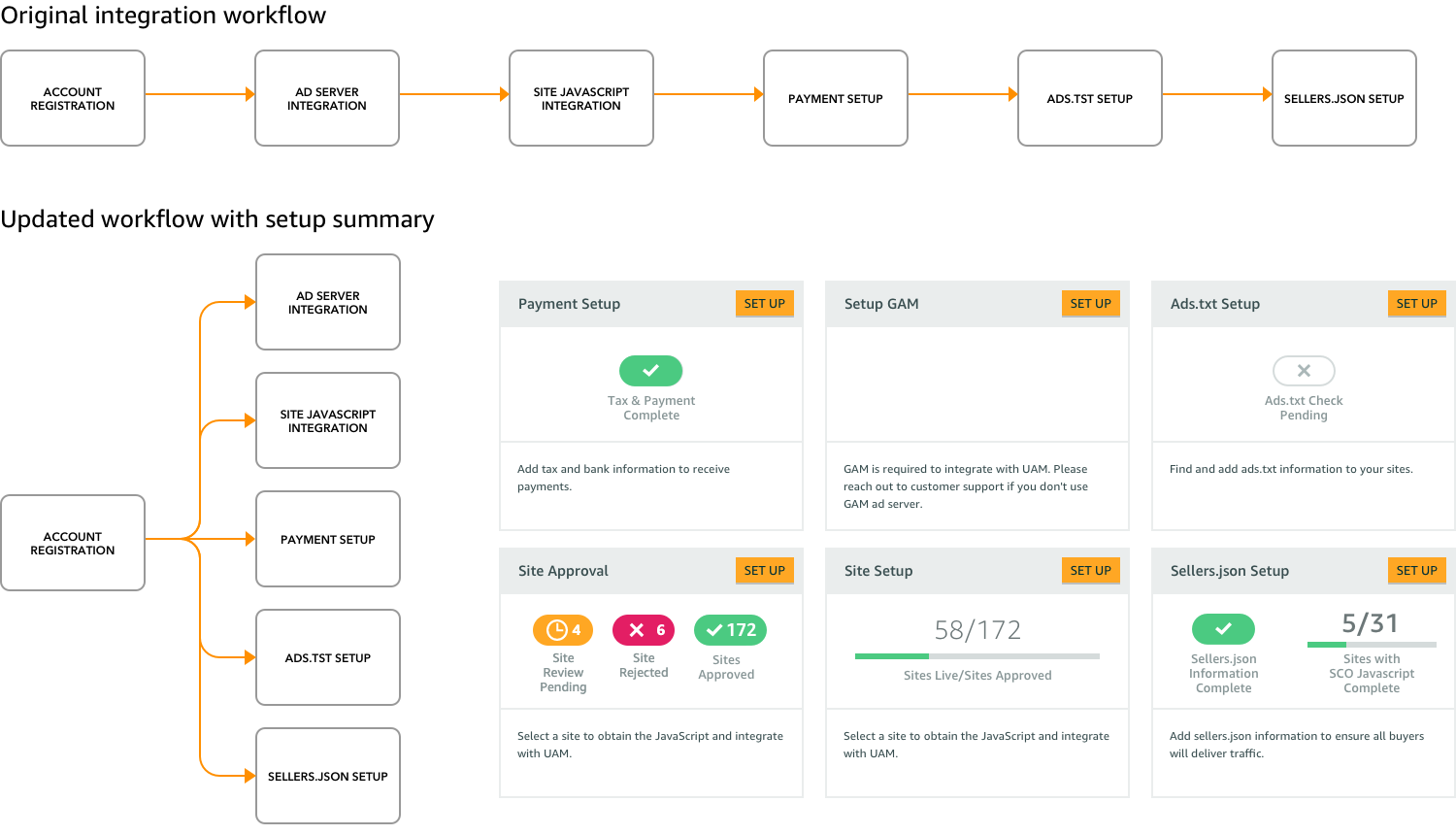 For many of our customers, the primary function of the portal is for onboarding and integrating their websites and apps with APS. When we first version of this workflow was primarily a linear one where we walked publishers through step by step. With the new IA we knew we would be breaking up this workflow into multiple sections for scability but we needed to maintain a efficient way for new publishers to still onboard.