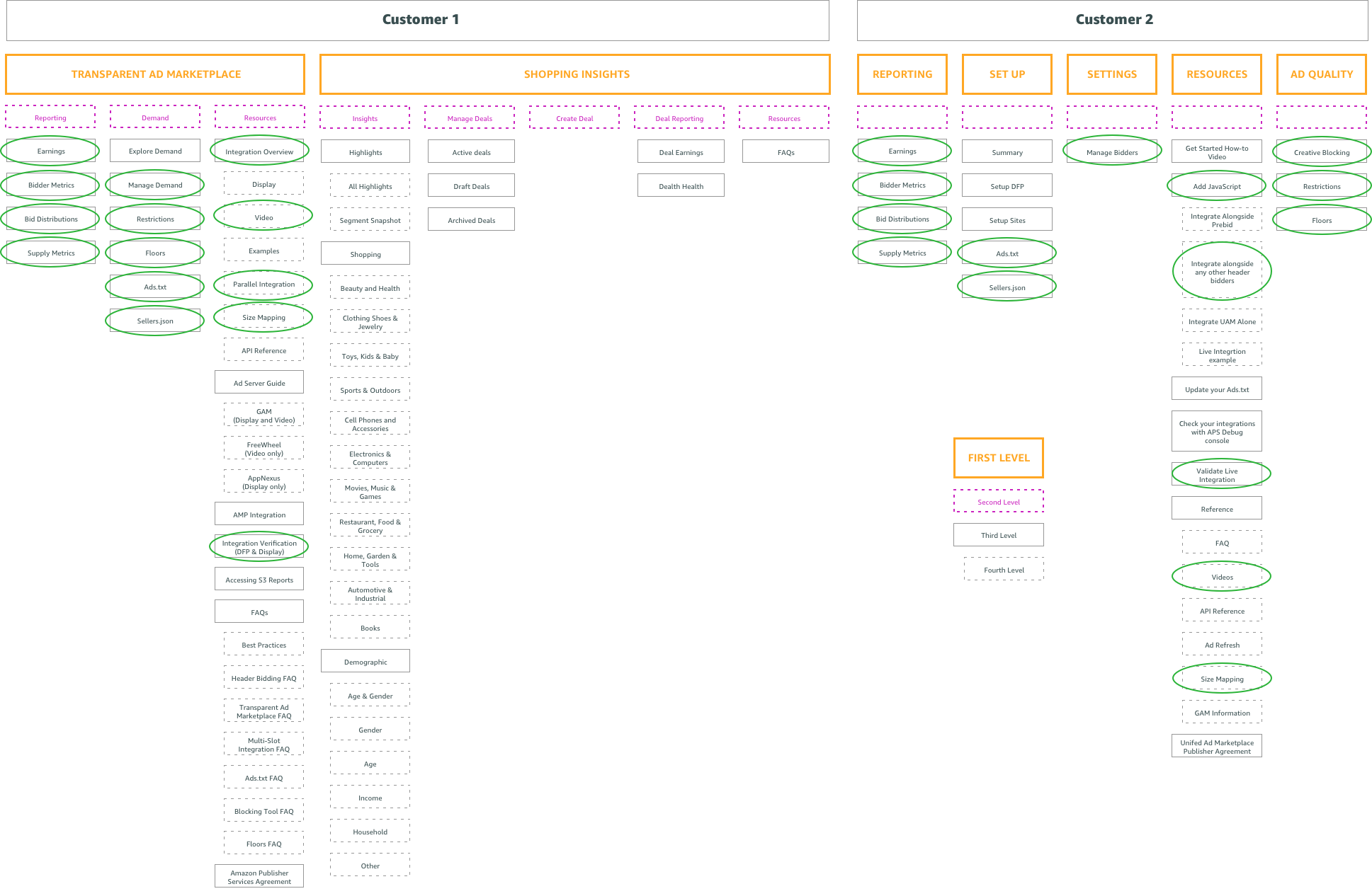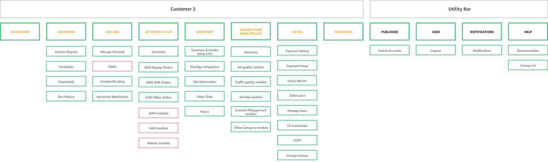 By picking and choosing which pages we need from the “umbrella” information architecture for specific user types, we can ensure a consistent experience across all users. In the example below you can see how we created the information architecture for “customer 2.” You can see the pages we selected (green) and omitted (red) for customers 1 and 2 in the examples below.
