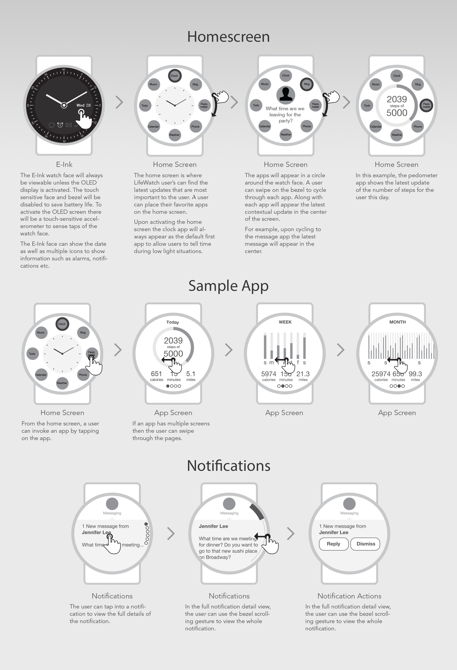The watch concept would consist of an e-ink screen for the watch face and a full-color screen for homescreen and apps. Through the gesture study, a concept langauge was developed to navigate between the 3 major types of screens.